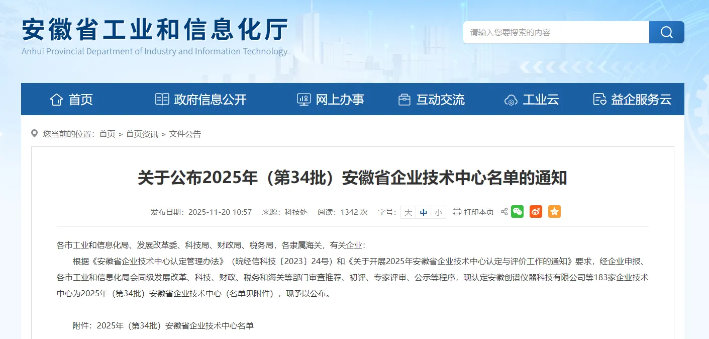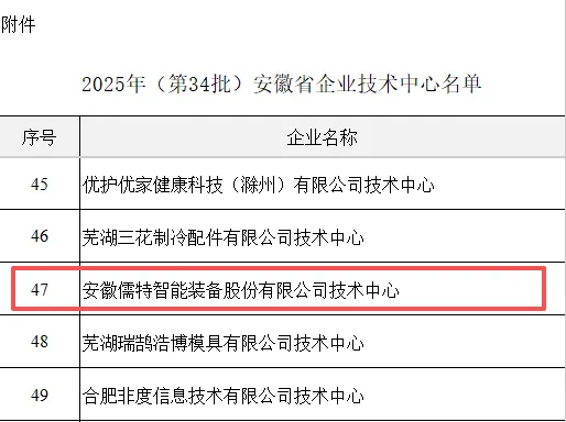 On November 20, the Anhui Provincial Department of Industry and Information Technology issued the Notice on Announcing the List of Anhui Provincial Enterprise Technology Centers for 2025 (34th Batch), and Anhui Root Intelligent Equipment Co., Ltd. was successfully certified as a Provincial Enterprise Technology Center.